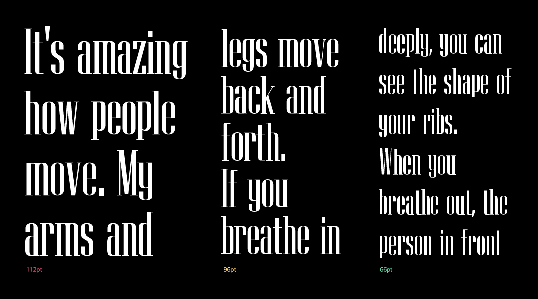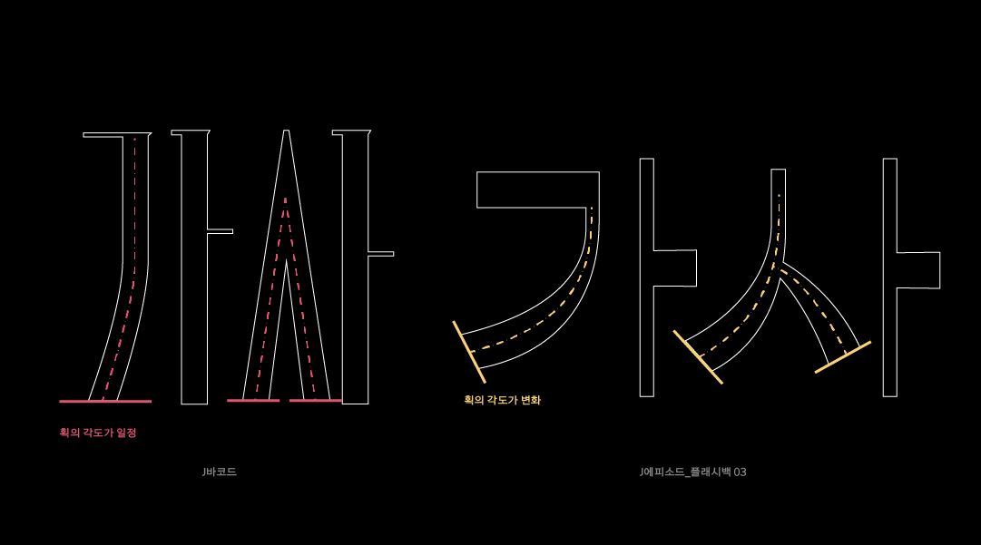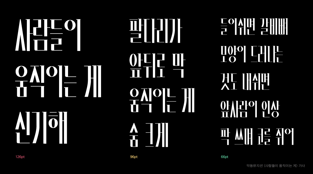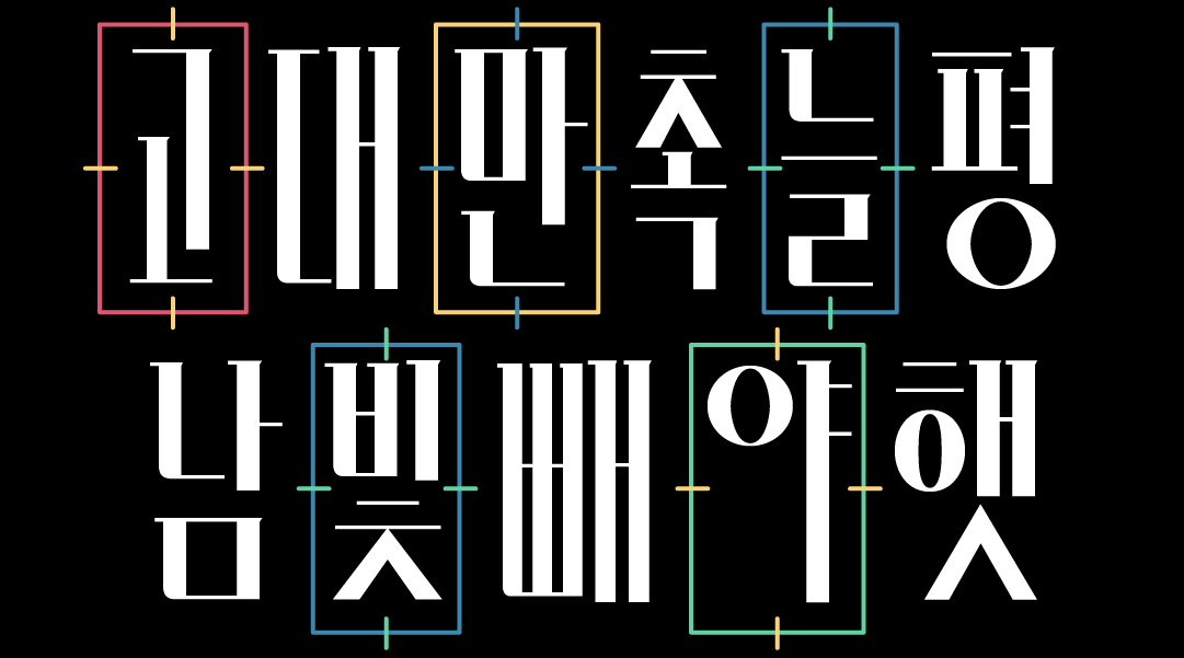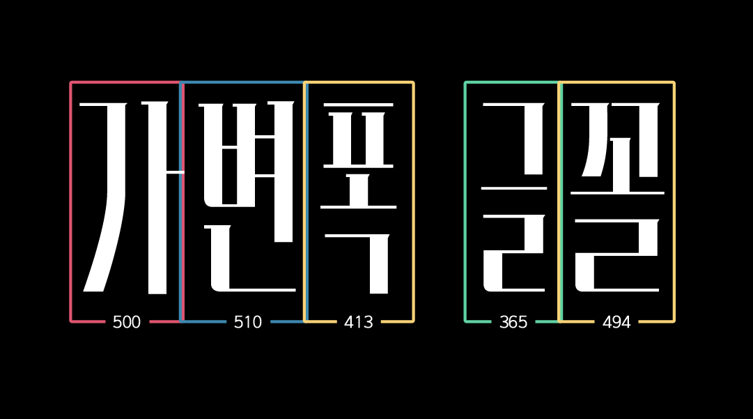 장체로 설계된 네모 틀안에 꽉 찬 자소 디자인과 함께 극단적인 획 대비가 멀리서 보면 마치 바코드와 같이 생겼습니다. 개성 강한 헤드라인 서체로 활용할 수 있는 제목용 서체입니다.