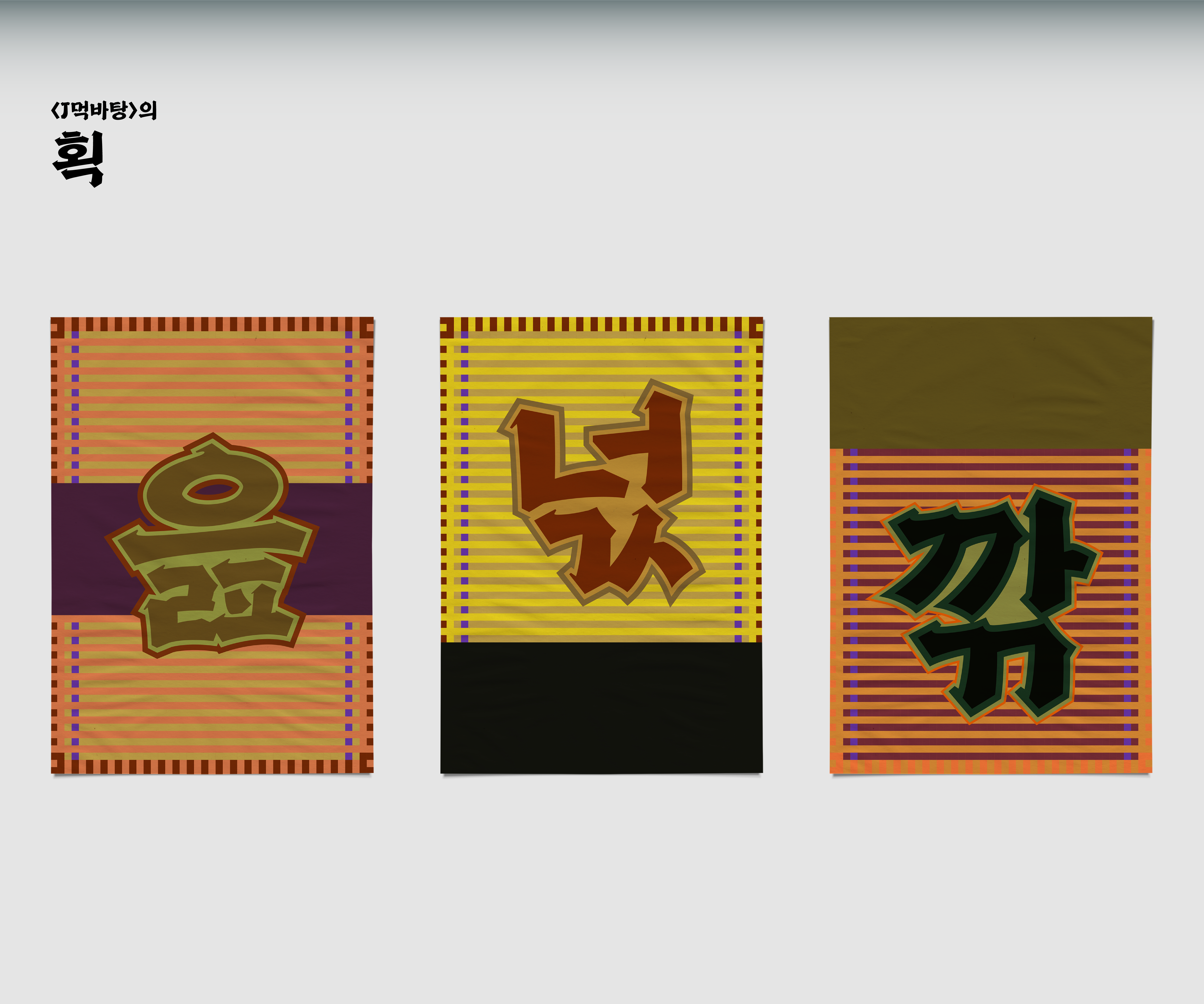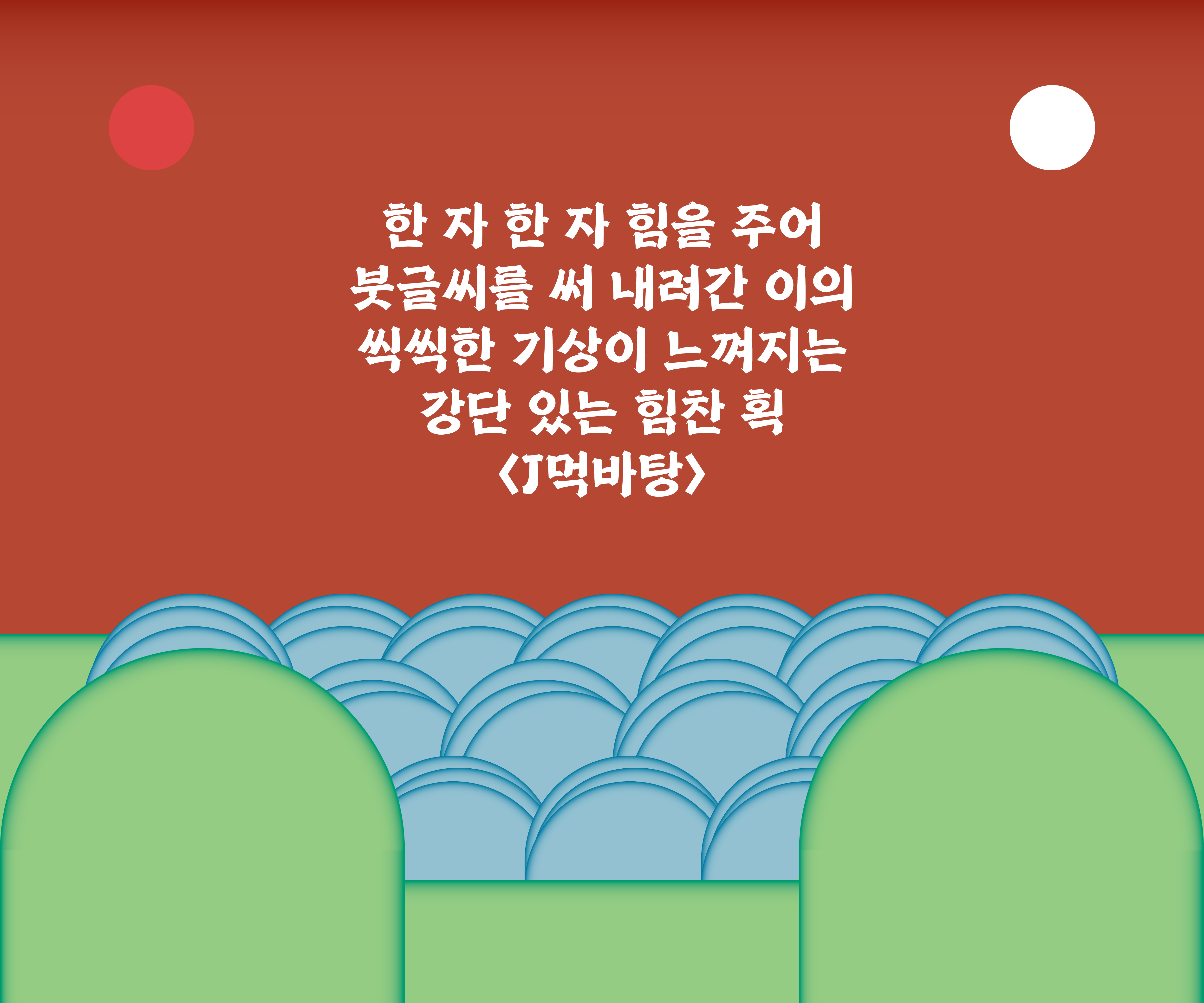 강단 있는 획에서는 한 자 한 자 힘을 주어 붓글씨를 써 내려간 이의 씩씩한 기상이 느껴집니다. 동양적인 뉘앙스와 강인함 그리고 묵직한 무게를 가진 서체 <J먹바탕>. 글자의 재료인 '먹' 이 머금은 이미지와 물성을 그대로 담아 <먹바탕> 이라는 이름으로 선보입니다.