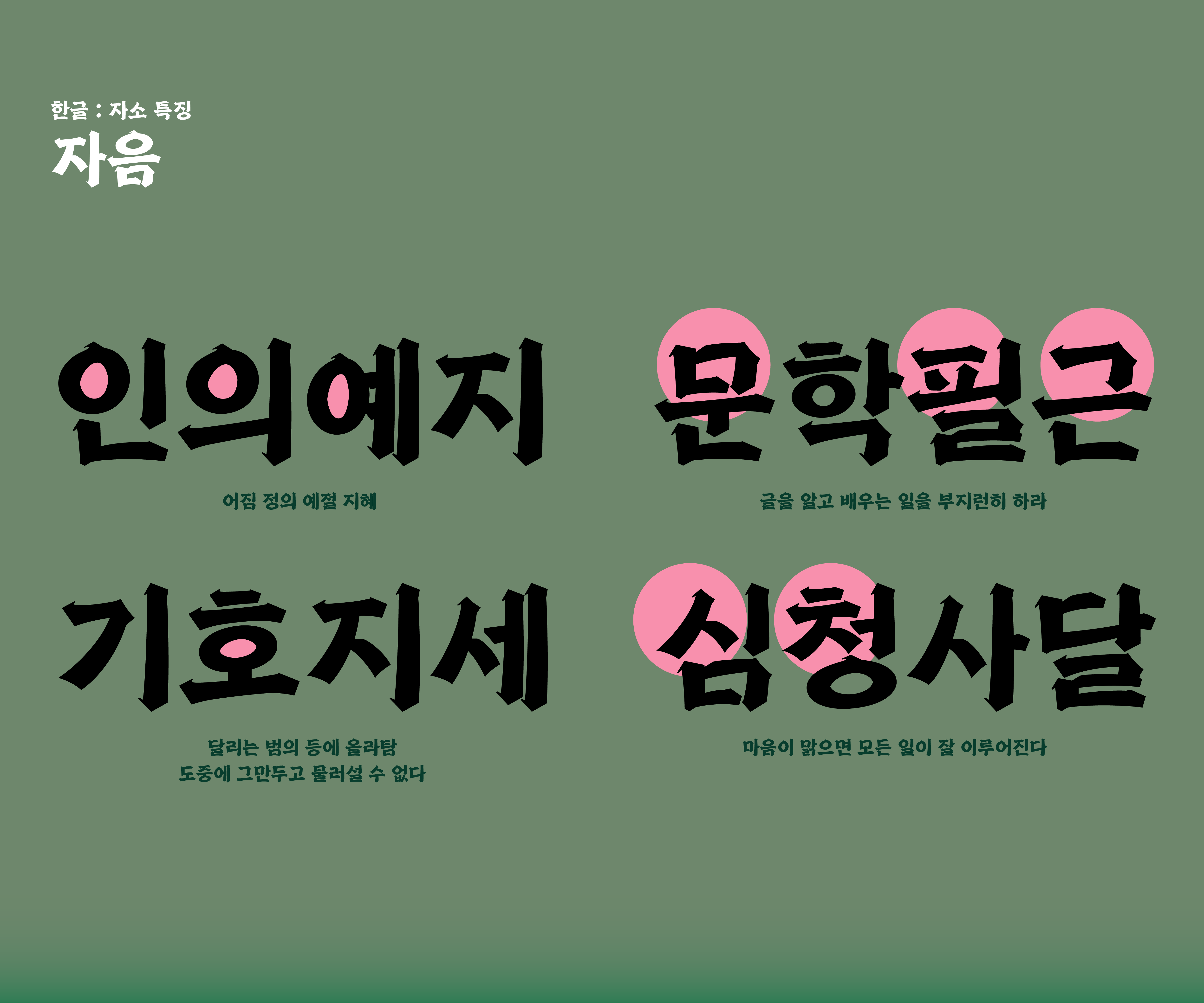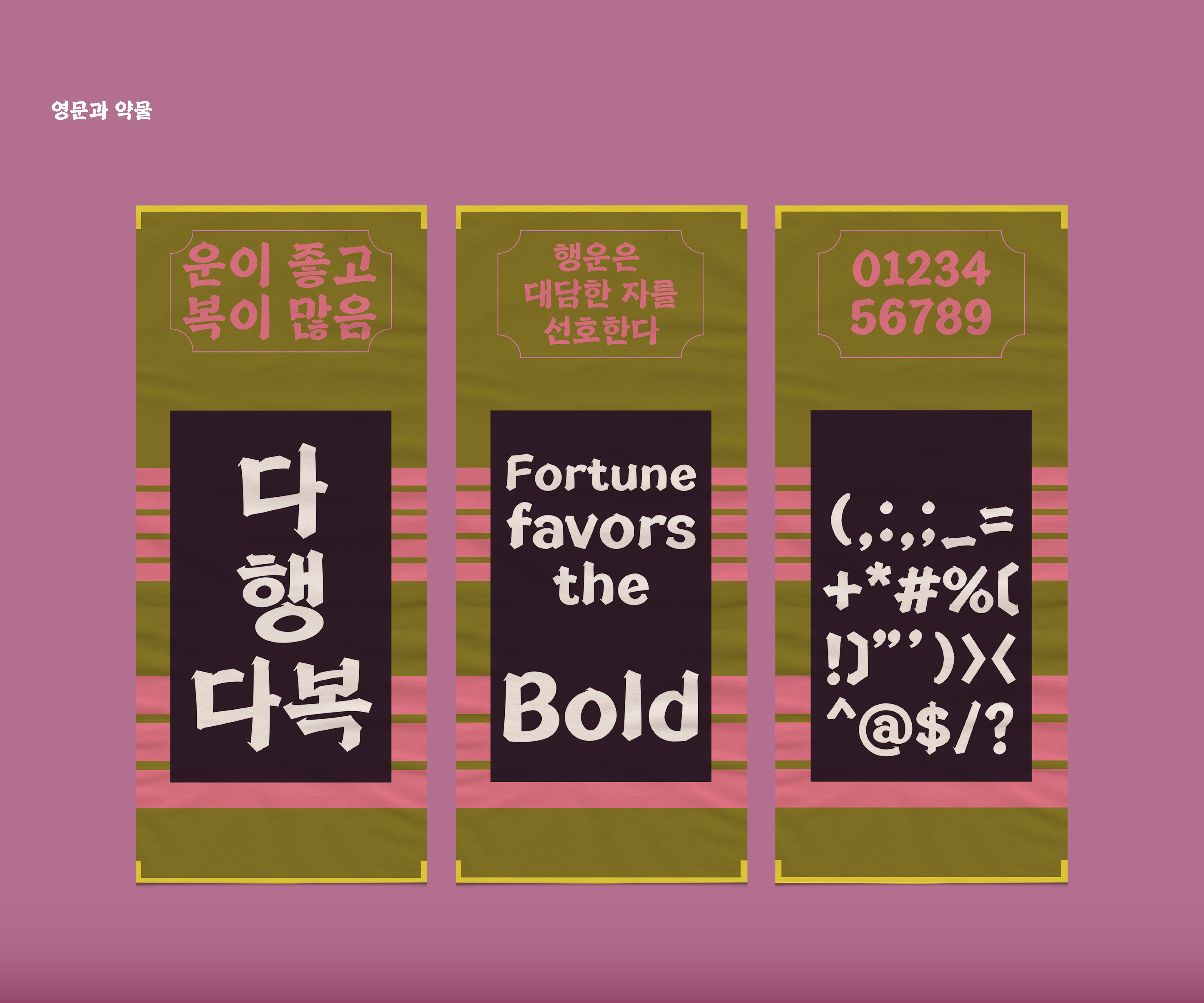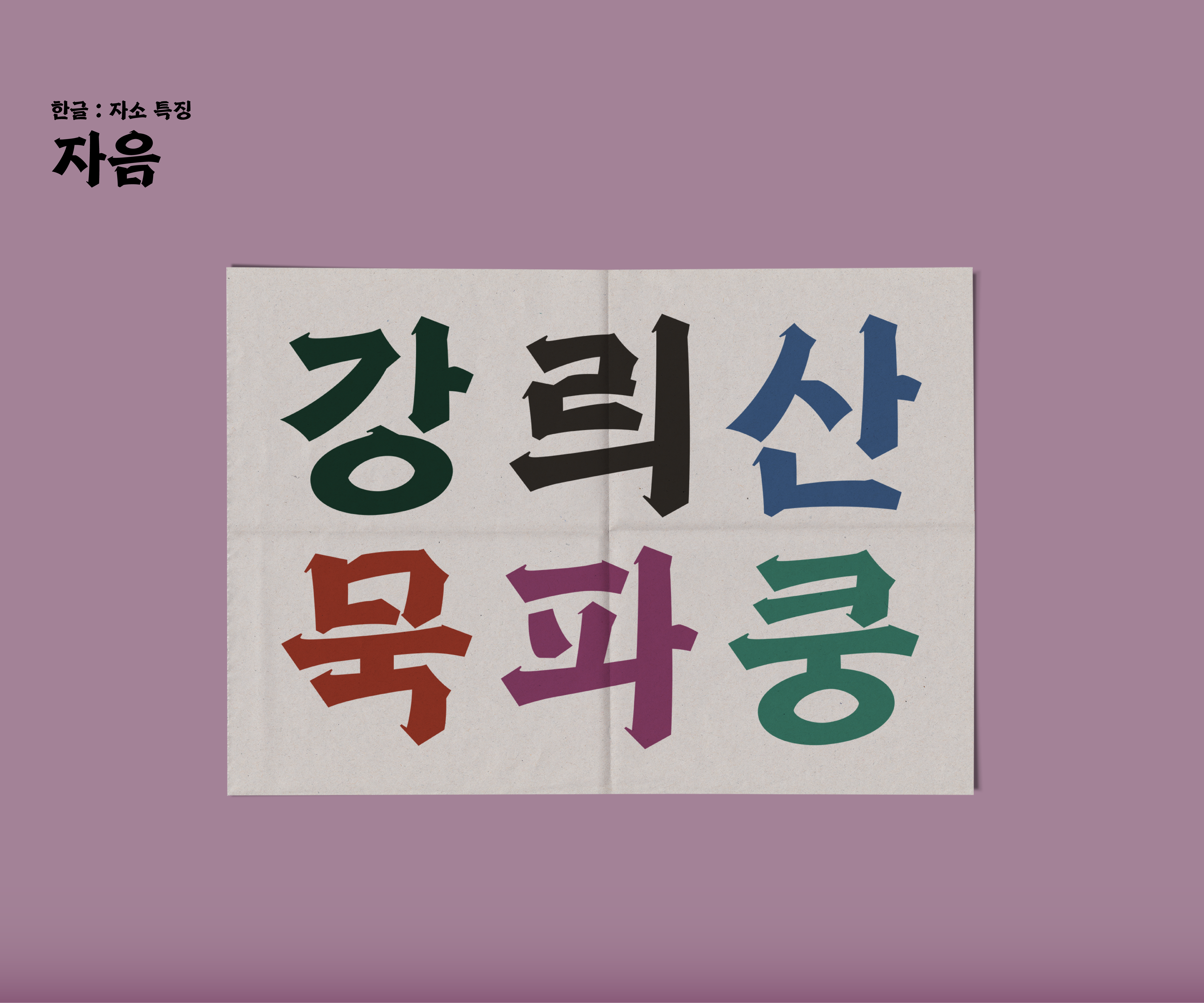 한자의 레퍼런스를 기반으로 한글에서도 같은 인상을 표현해 보고자 기획한 제목용 서체입니다.