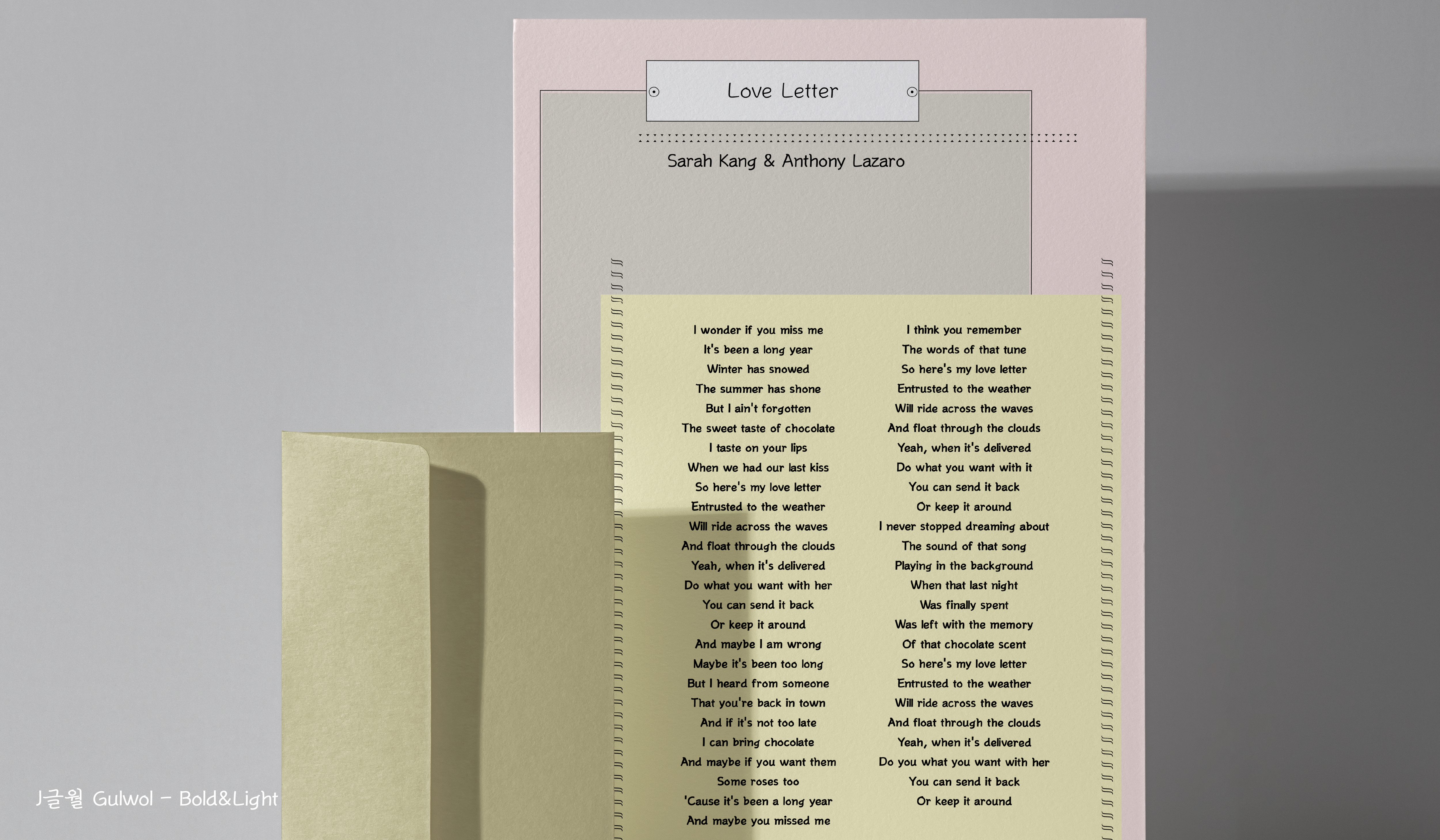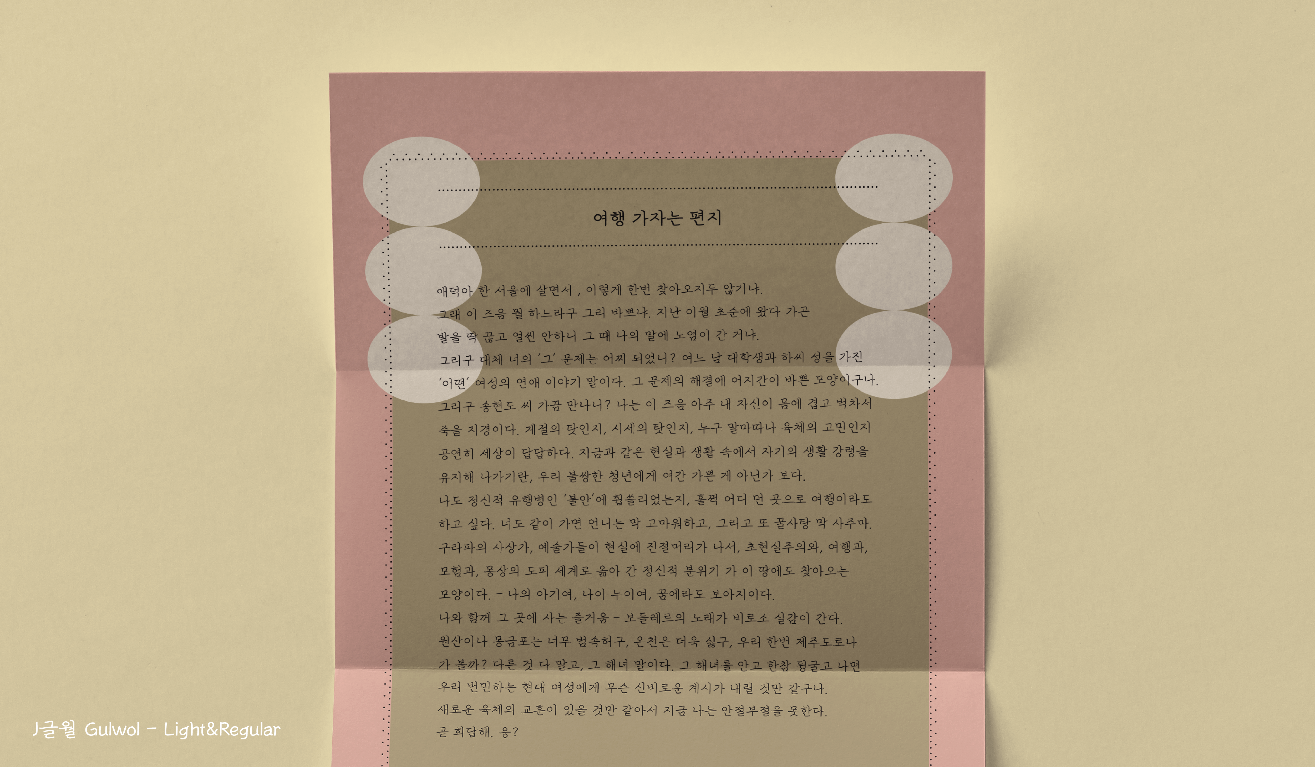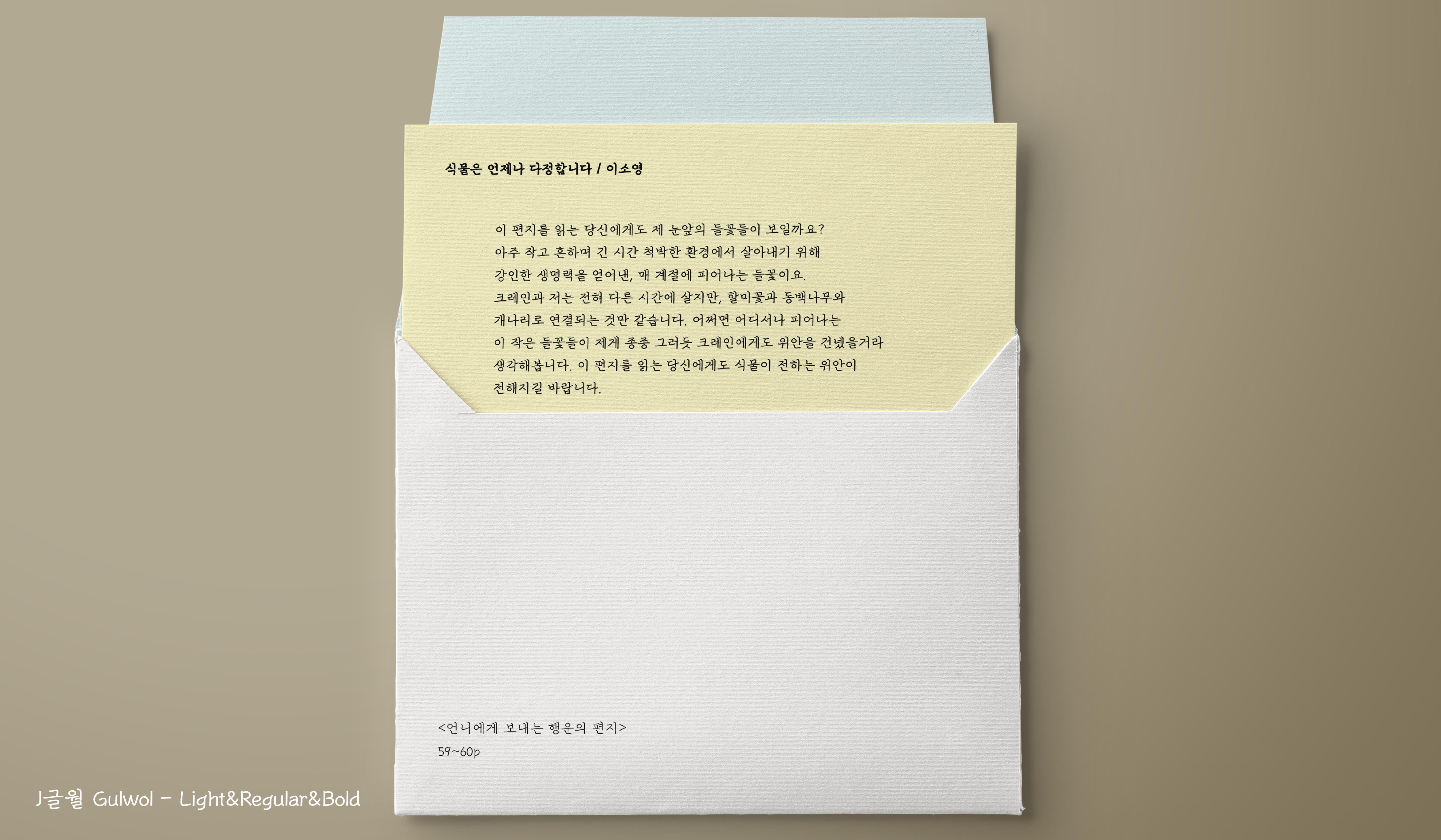 익숙하고 친밀한 인상 그리고 정돈된 획에서 오는 깔끔함이 매력적인 서체이며 3종 굵기로 구성되어 있습니다. 어떤 매체에도, 어떤 콘텐츠에도 글월만의 정갈하고 친근한 인상으로 따뜻한 지면의 질감을 표현할 수 있습니다.