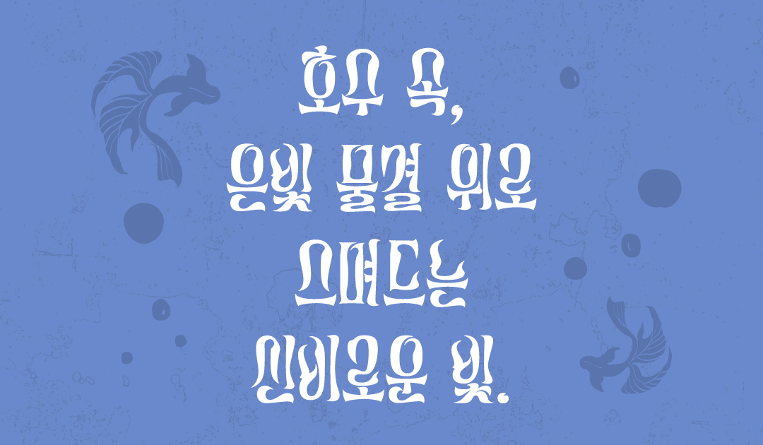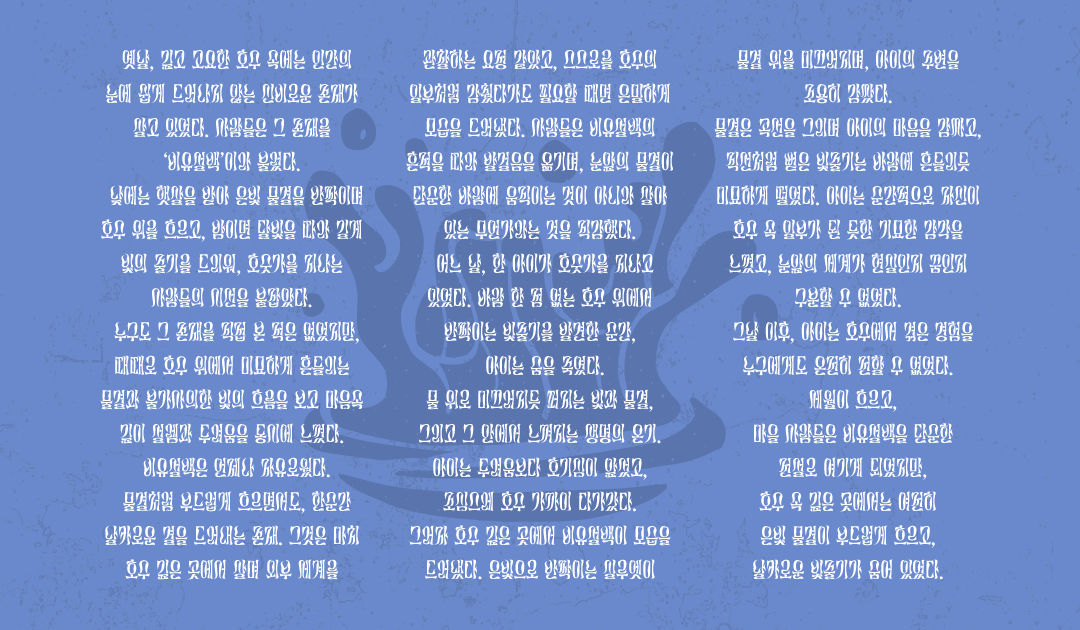 비유설백은 호수에 사는 인어 요괴의 형태에서 영감을 받아 곡선과 직선이 우아하게 조화를 이루는 것이 특징입니다. 전반적인 인상은 물결저럼 부드럽게 흐르는 유기적인 형태이며 ‘ㅁ’과 ‘ㄷ’과 같이 막힌 획 바깥쪽은 직선으로, 내부는 물결처럼 곡선으로 처리해 흥미롭고 조화로운 대비를 주었습니다. 네모틀 안에 꽉 차는 장체 구조를 가지며, 글자 너비와 자간을 좁게 설정하여 글자가 하나의 덩어리처럼 느껴지게 함으로써 가독성과 밀도를 높였습니다.