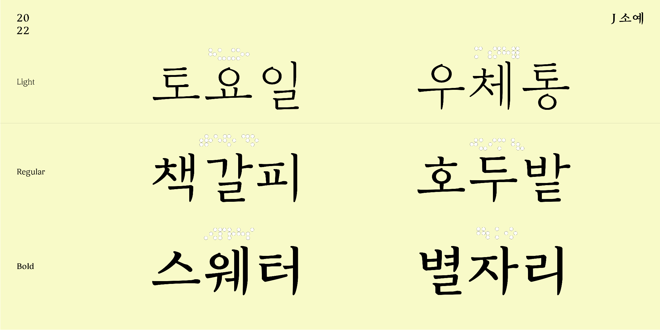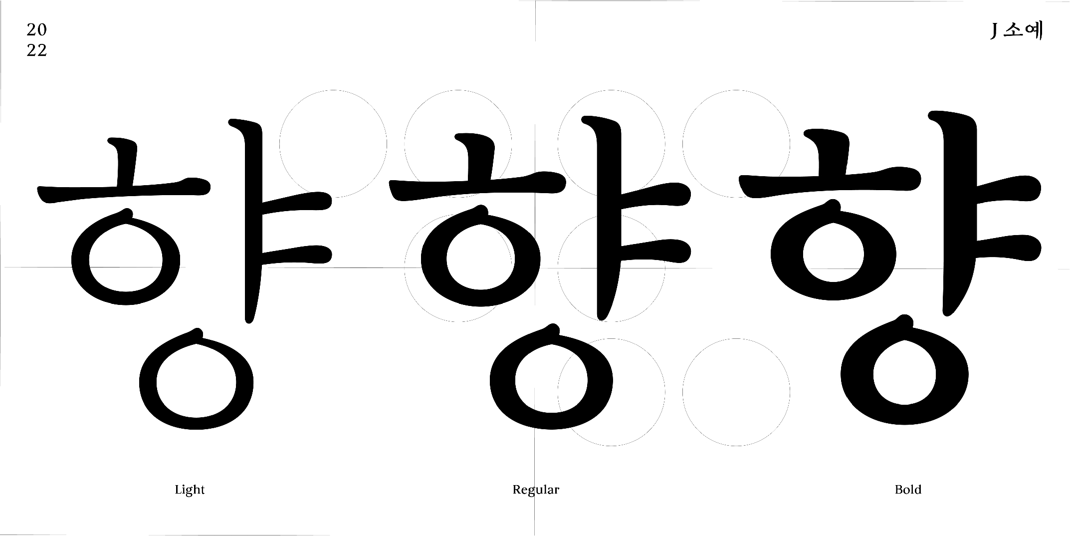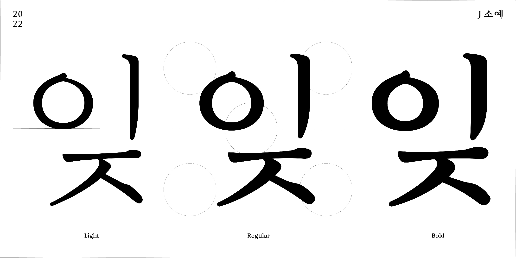 J소예 Light, Regular, Bold 총 3종으로 구성되어 있으며, 각 굵기별 획 각도 조절과 자소의 일부 디자인의 디테일을 차별화 두어 디자인했습니다.