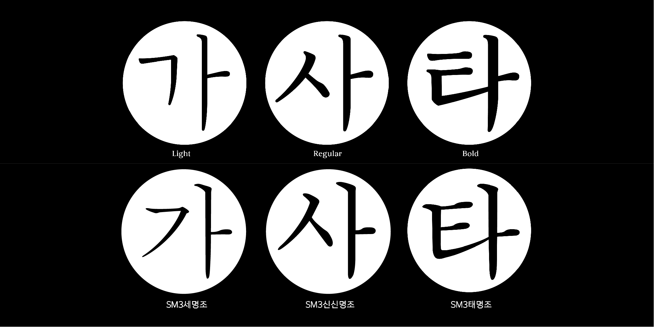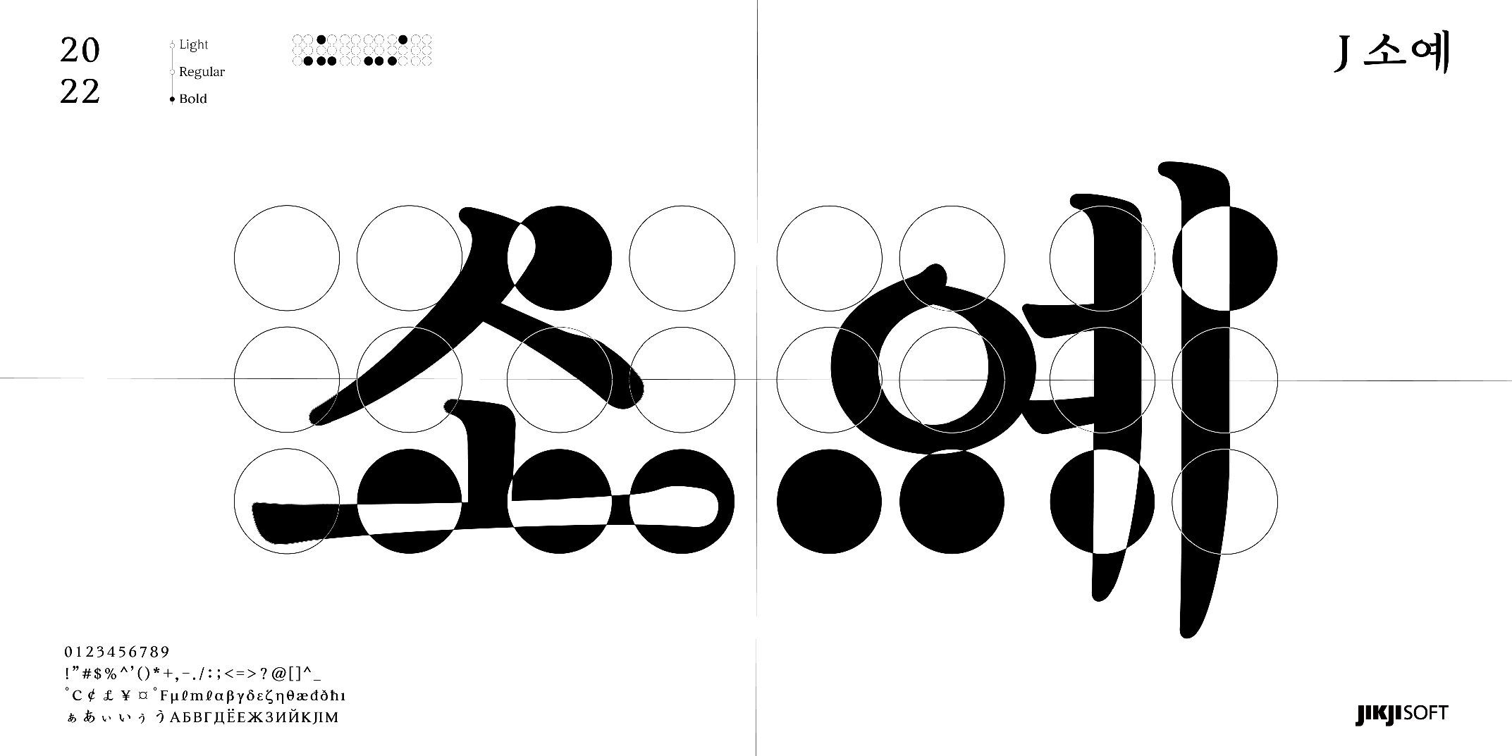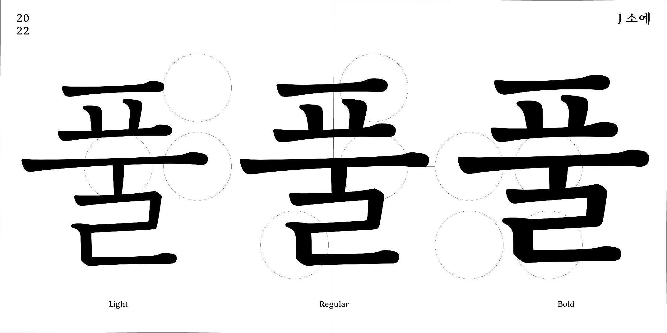 J소예 Light, Regular, Bold 총 3종으로 구성되어 있으며, 각 굵기별 획 각도 조절과 자소의 일부 디자인의 디테일을 차별화 두어 디자인했습니다.