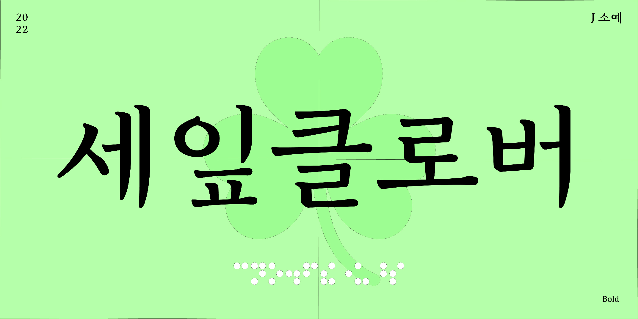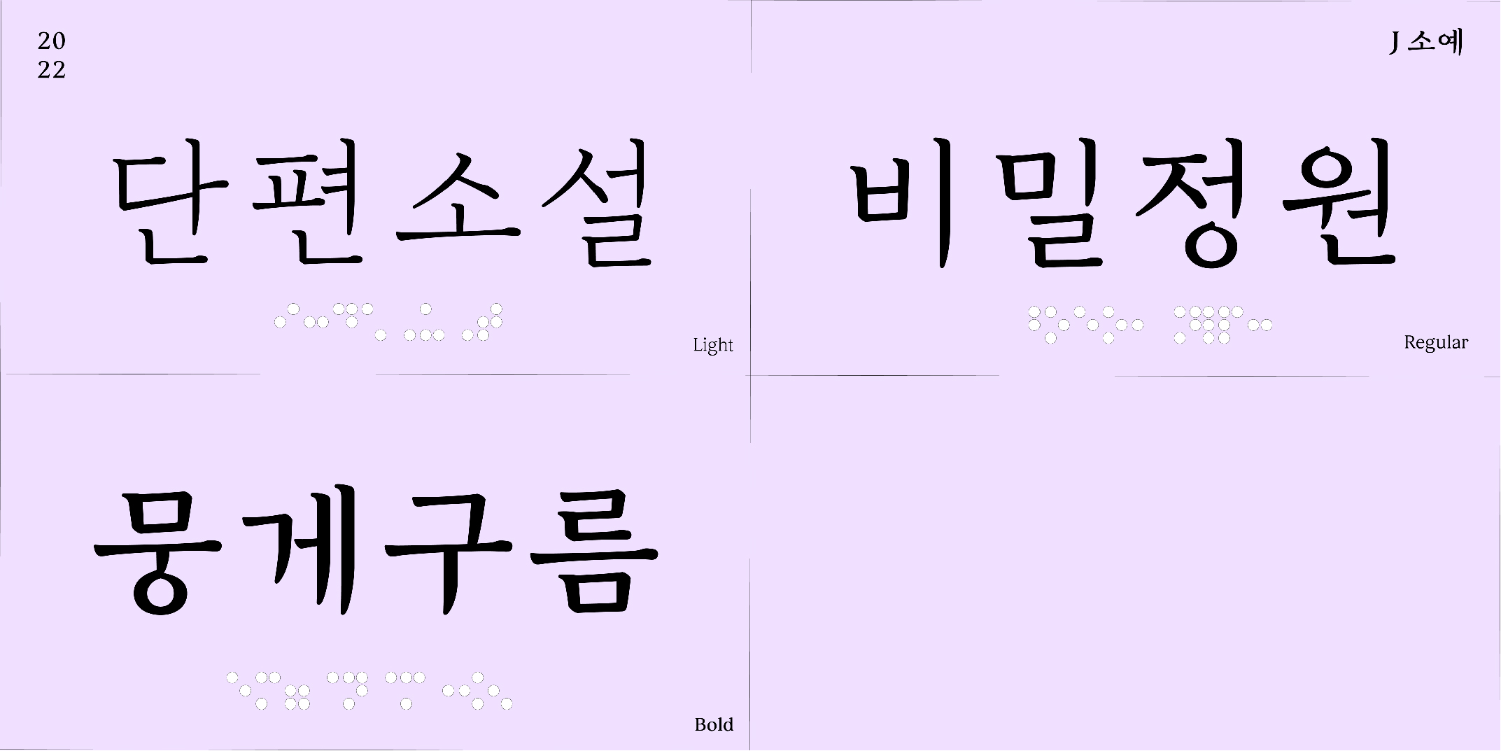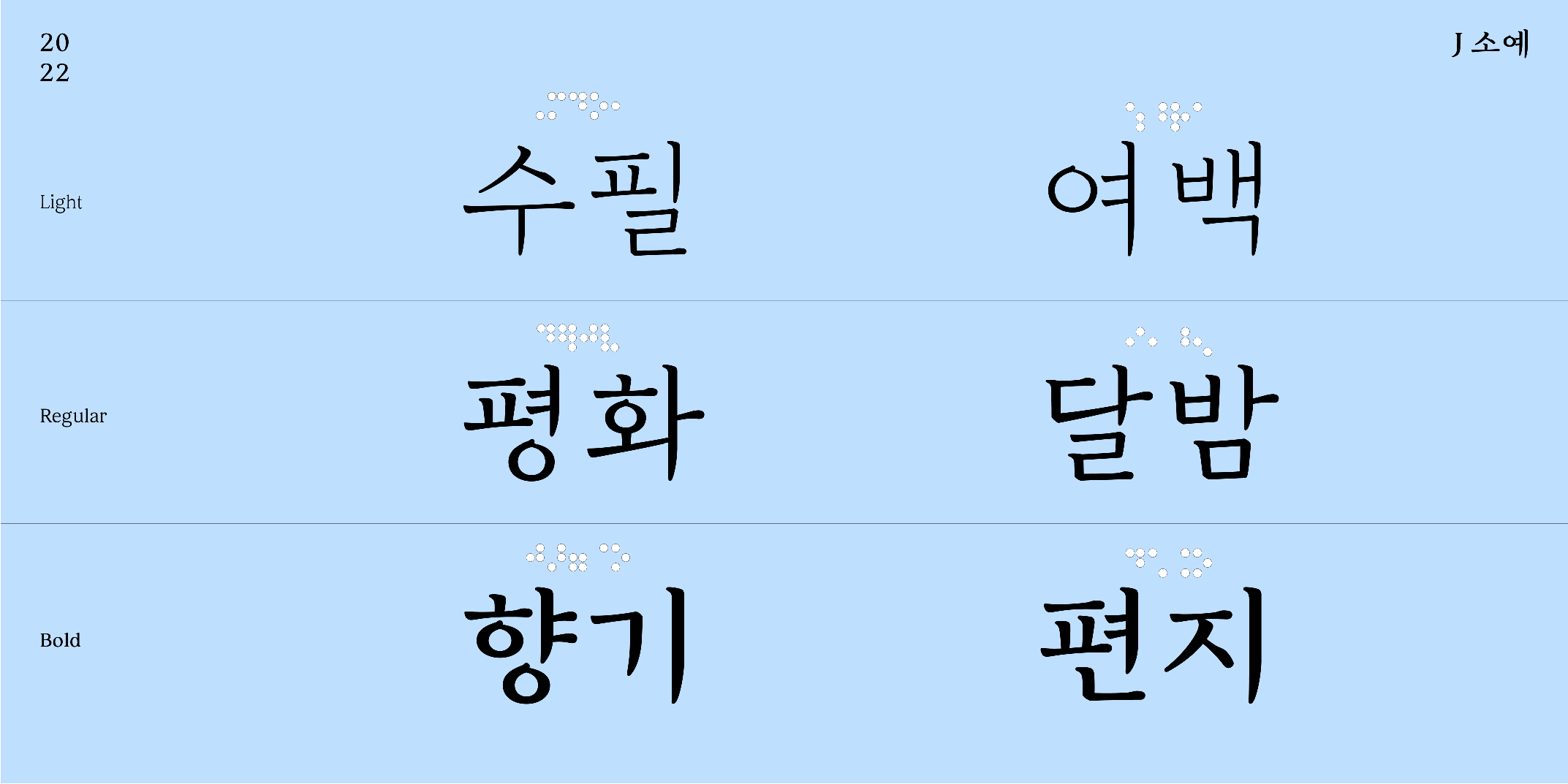 우연히 접한 <훈맹정음> 자료에서 맹인을 위해 만든 한글 점자와 함께 한 글자 한 글자 정성스럽게 쓴 손글 씨는 J소예의 구조적 틀과 자소 디자인에 많은 영감을 주었습니다.