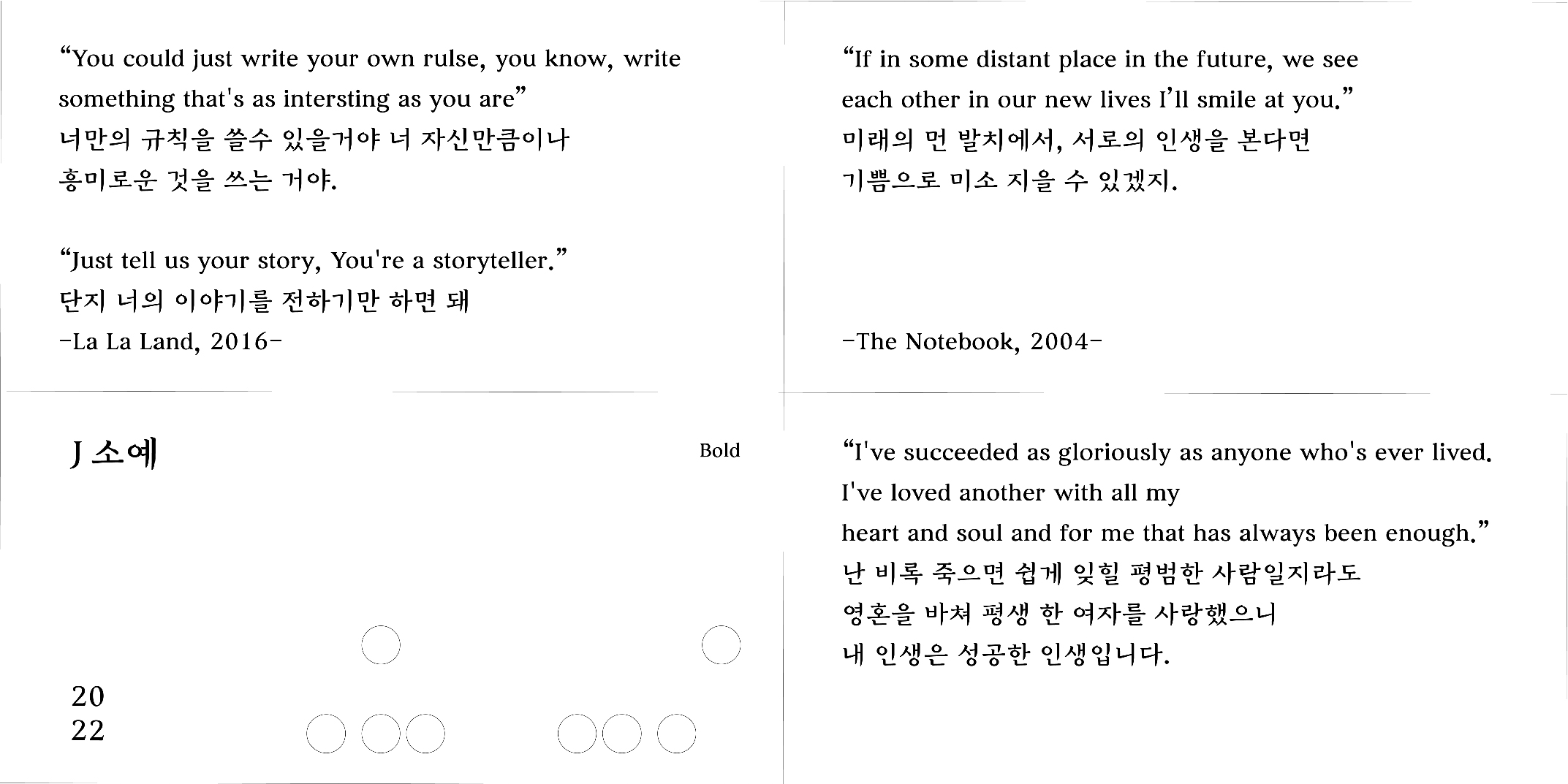 J소예는 한글의 본질에 충실하고자 소담스럽고 예쁜 이라는 순우리말을 서체 이름으로 정했습니다.